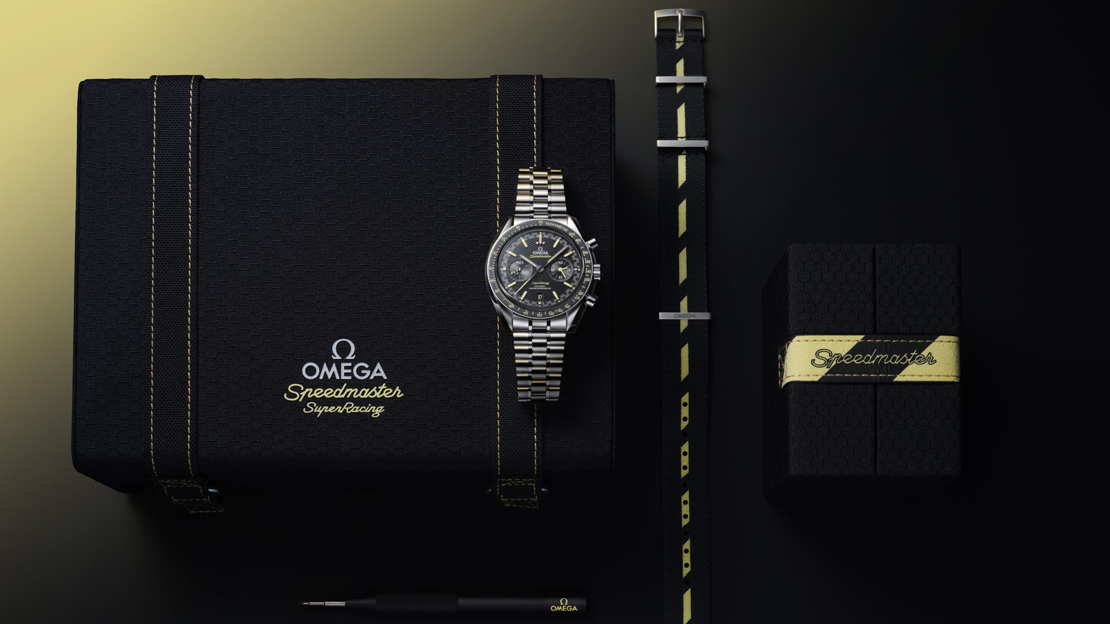 The timepiece is delivered in a honeycomb pattern Speedmaster watch box in black with yellow stitching, which includes a recycled nylon NATO strap with black and yellow stripes.